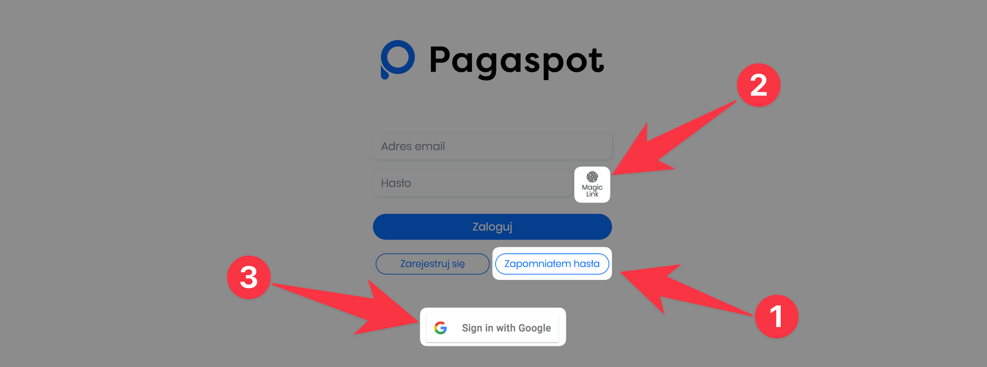 Wypełnij pole z mailem i kliknij Magic Link, Pagaspot wyśle do Ciebie mailowo link, po kliknięciu w niego otworzy Ci się zalogowane konto. - Sign in with Google