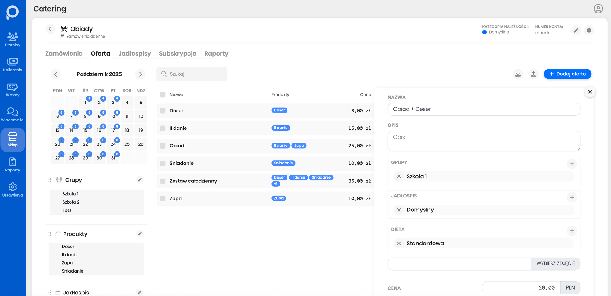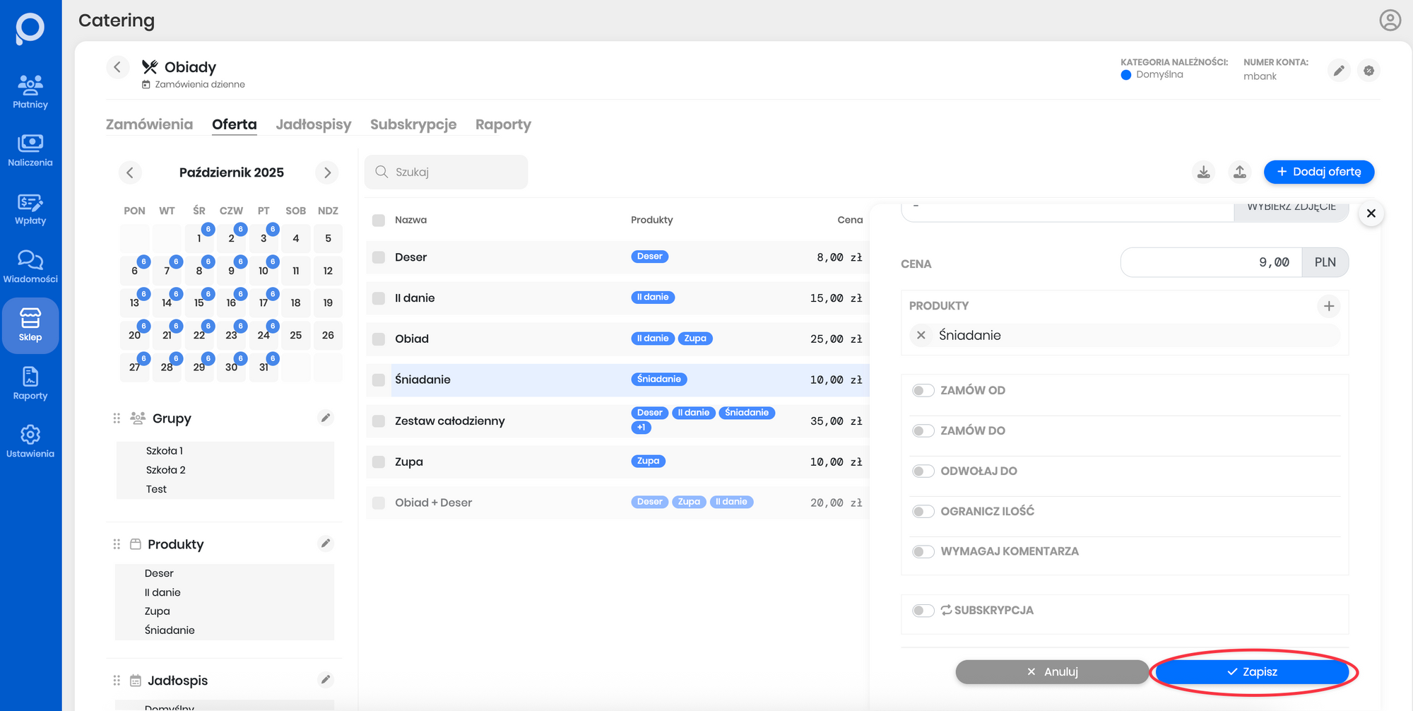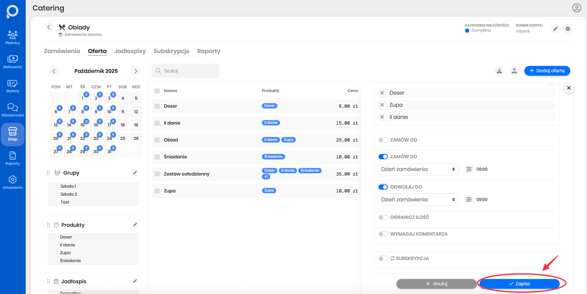 3. Skonfiguruj pozycję w ofercie dodając: nazwę, grupy, dla których ma być ona dostępna, jadłospis (Domyślny lub wybrany inny jeśli jest więcej niż jeden), ustal cenę, produkty, które są dostępne w zamówieniu oraz godziny, do których można zamówić i odwołać pozycję w ofercie,