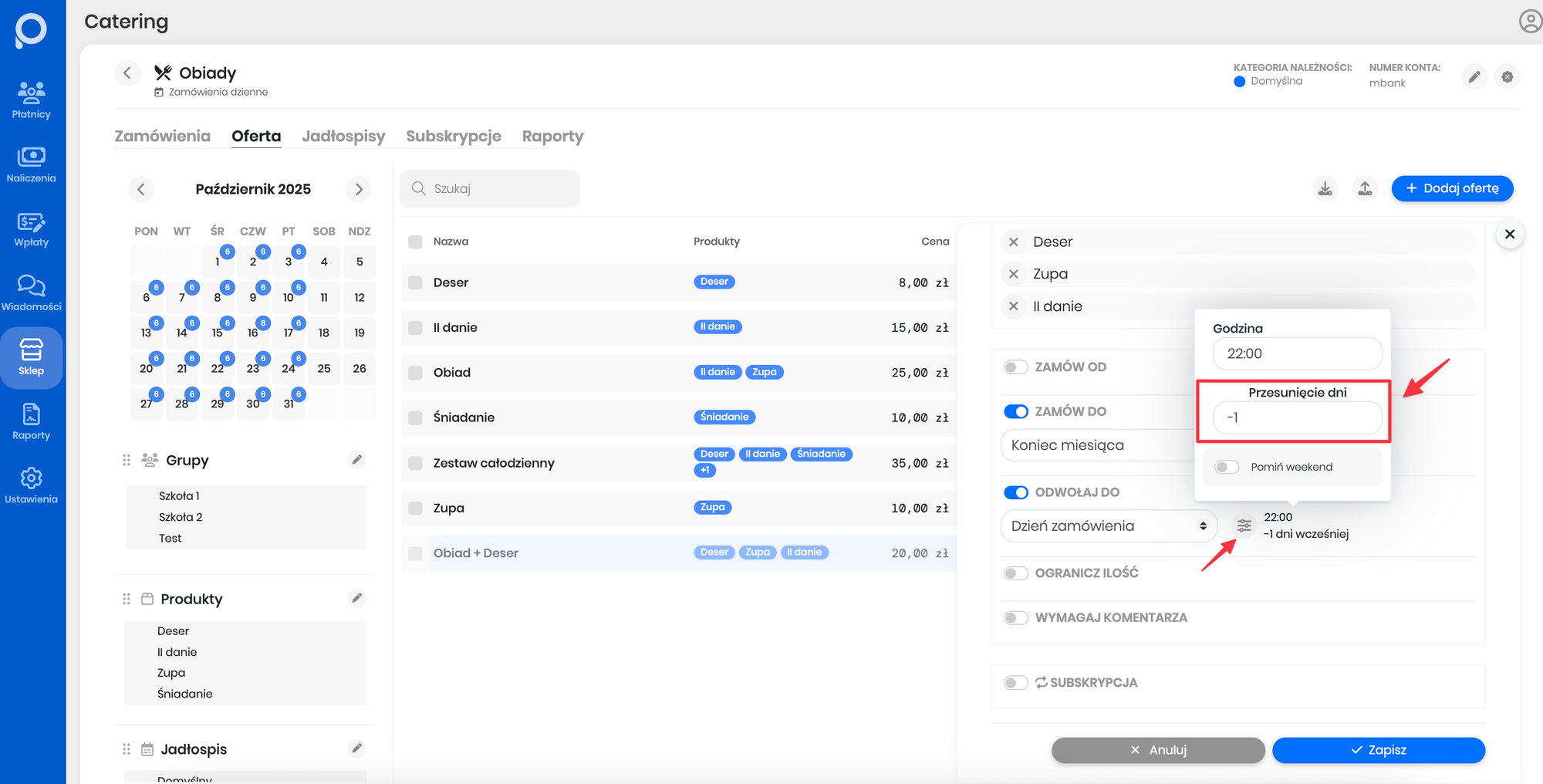 *Jeśli przy ustawianiu godziny zamawiania i odwoływania chcesz, aby oferta blokowała się dla użytkowników np. w czwartek o godzinie 22:00 przy składaniu zamówienia na piątek, należy kliknąć w ikonkę ustawień na prawo od "Dnia zamówienia" i w oknie "Przesunięcie dni" wpisać "-1".