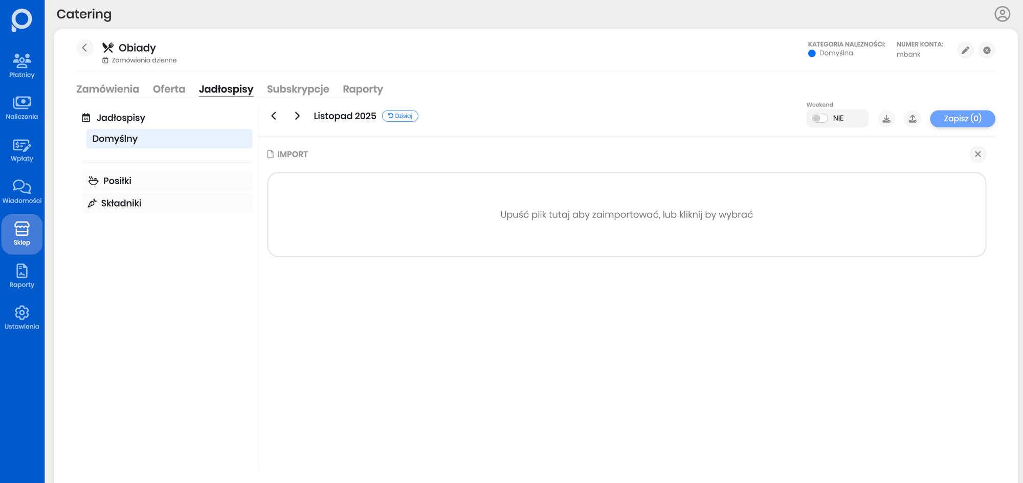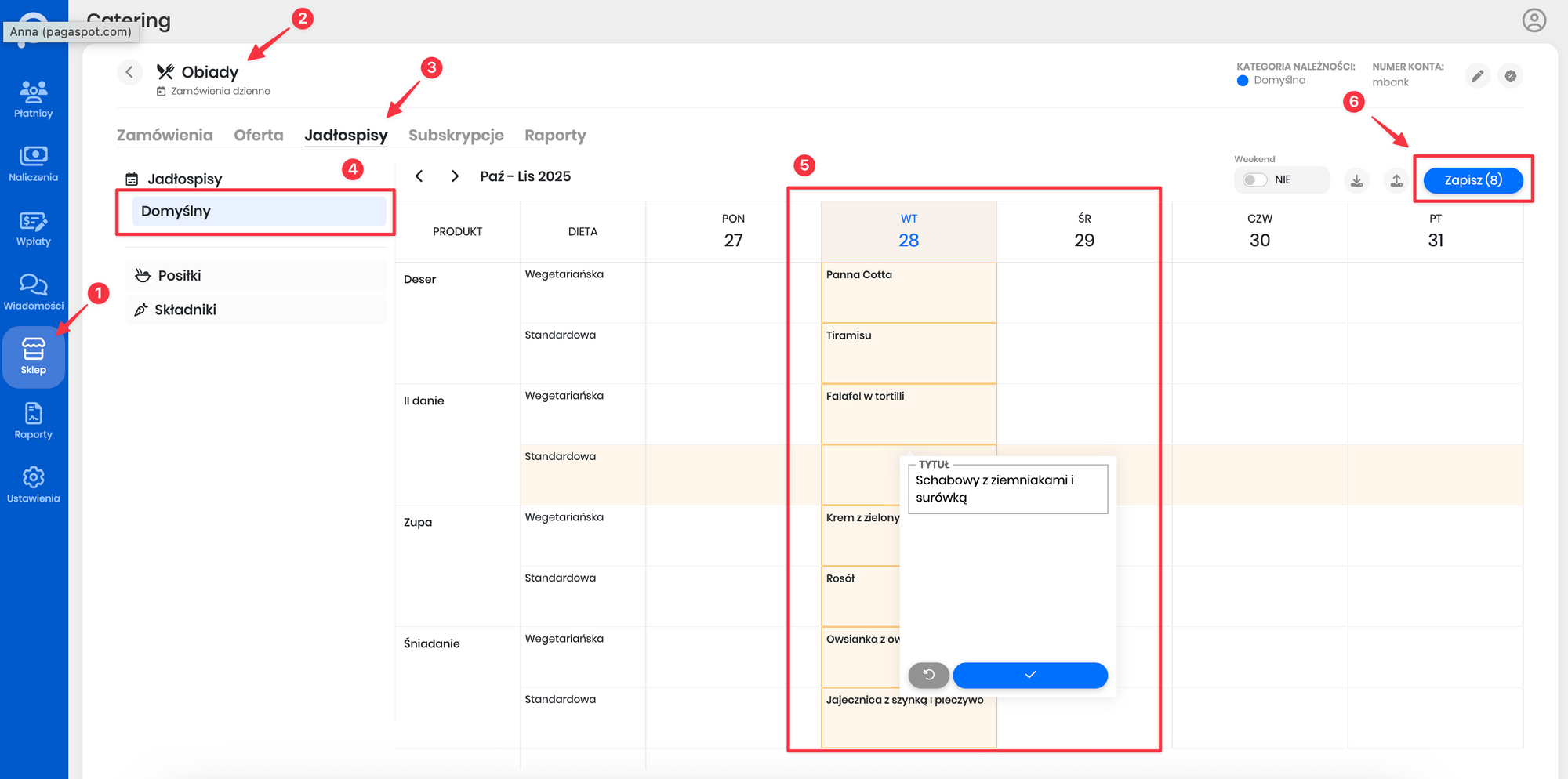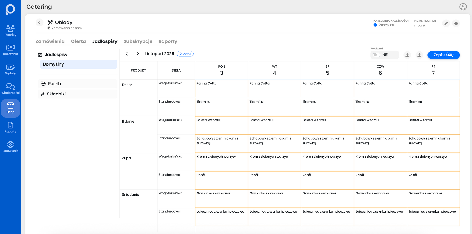 Po zapisaniu zmian jadłospis zostanie zapisany w systemie i będzie wyświetlał się użytkownikowi w poszczególne dni przy składaniu zamówienia.