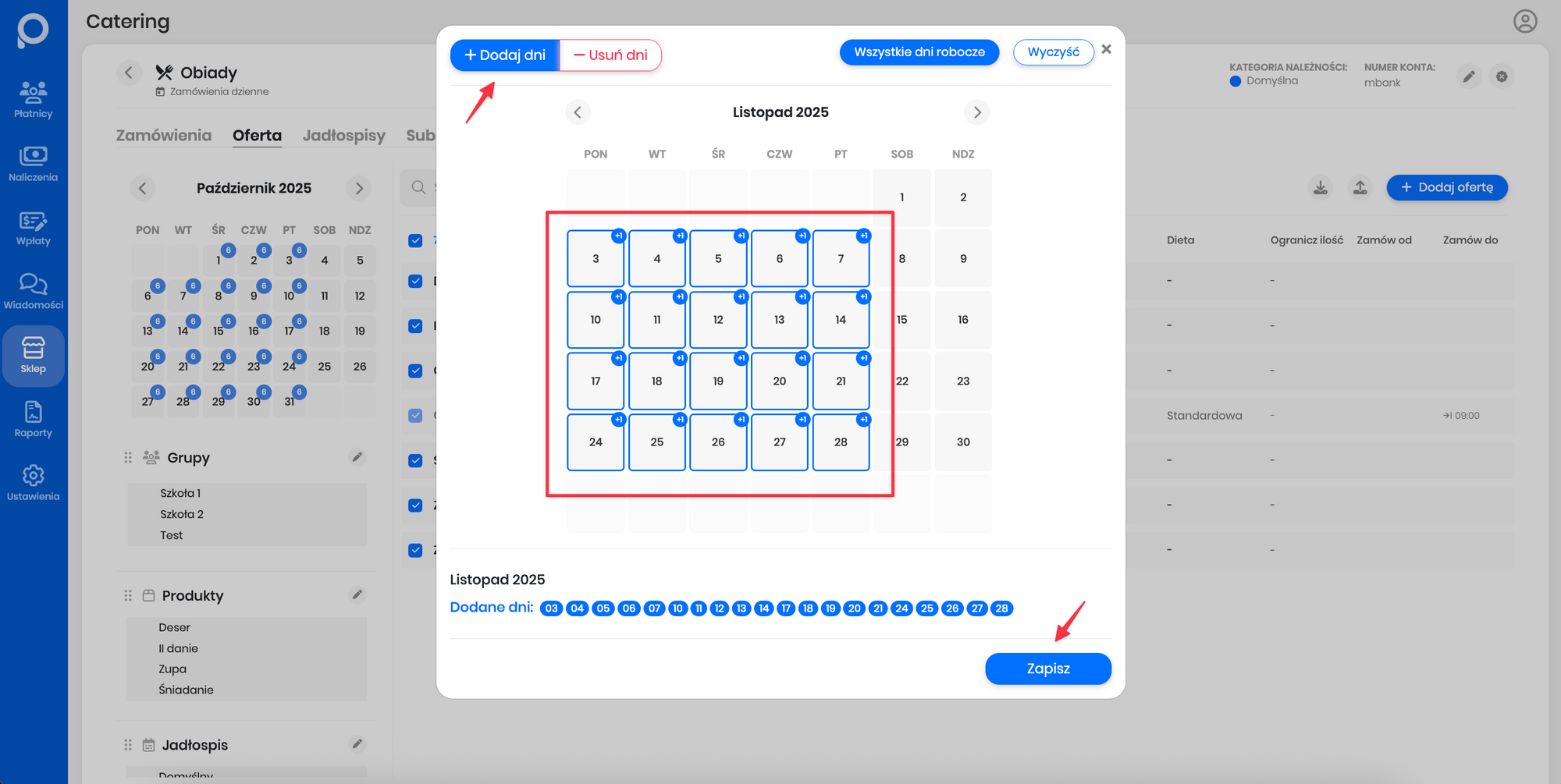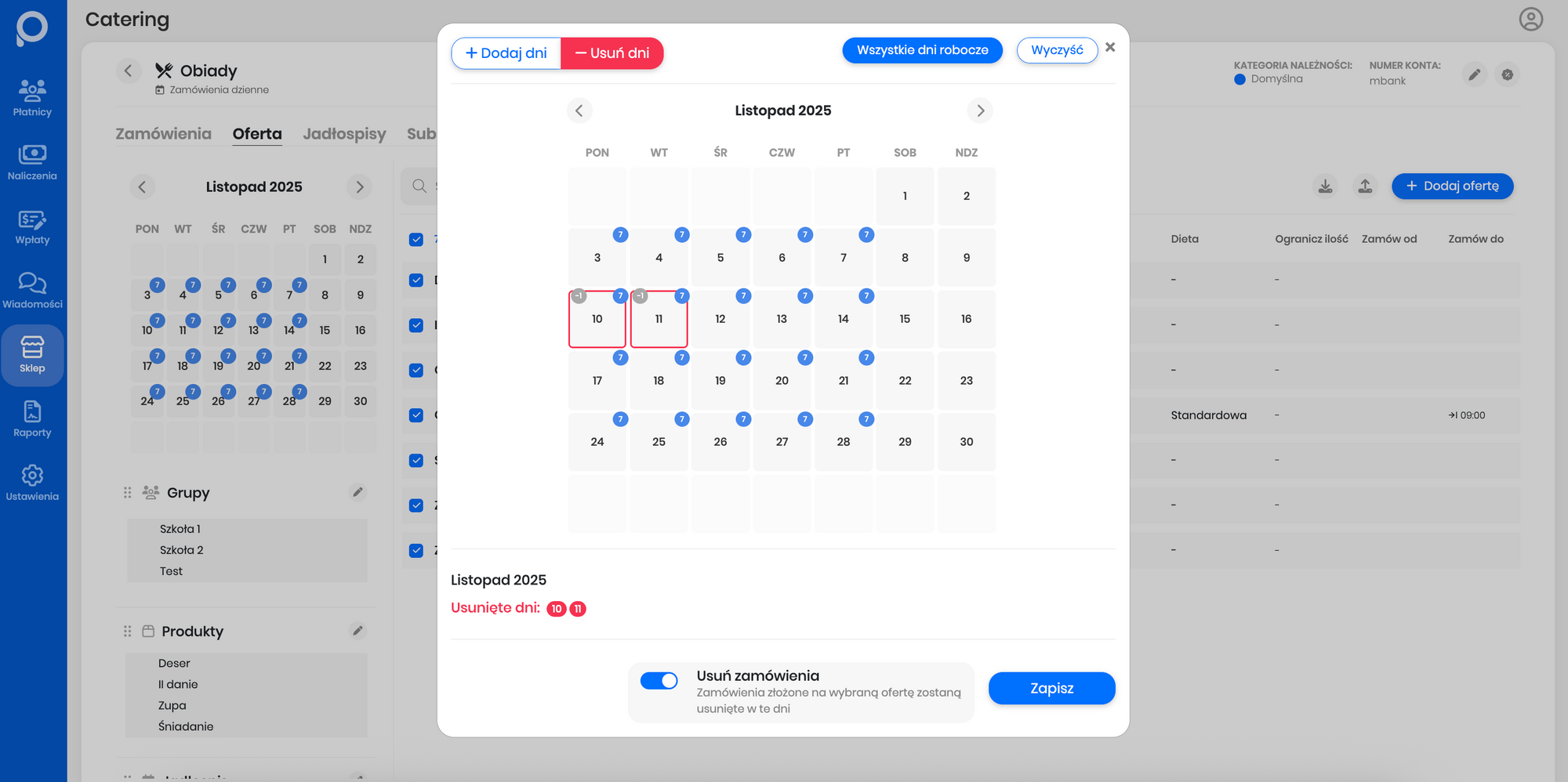 Dni, które chcemy usunąć zaznaczą się w kalendarzu na czerwono i wyświetli się suwak "Usuń zamówienia". Należy go zaznaczyć, jeżeli chcesz by system odwołał wszystkie zamówienia, które użytkownicy zdążyli złożyć na dany dzień przed usunięciem oferty. Aby zatwierdzić usunięcie należy kliknąć przycisk "Zapisz".