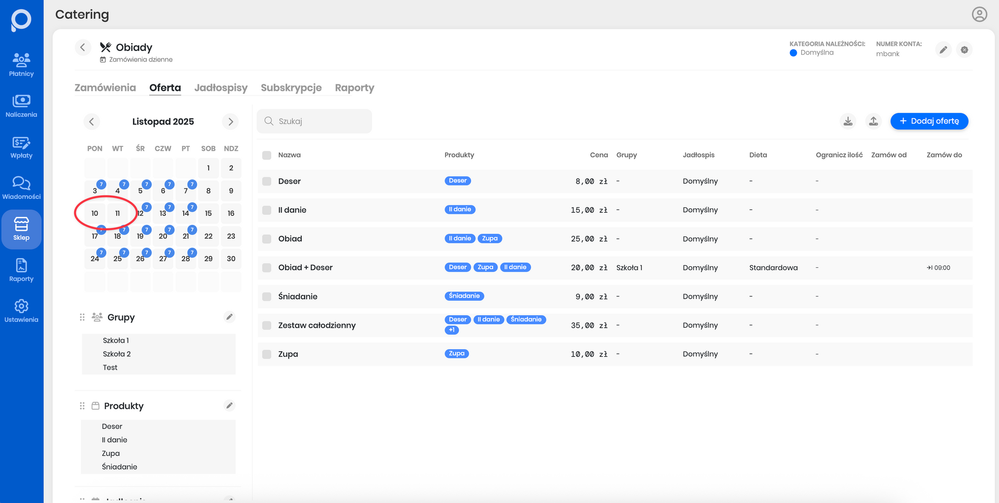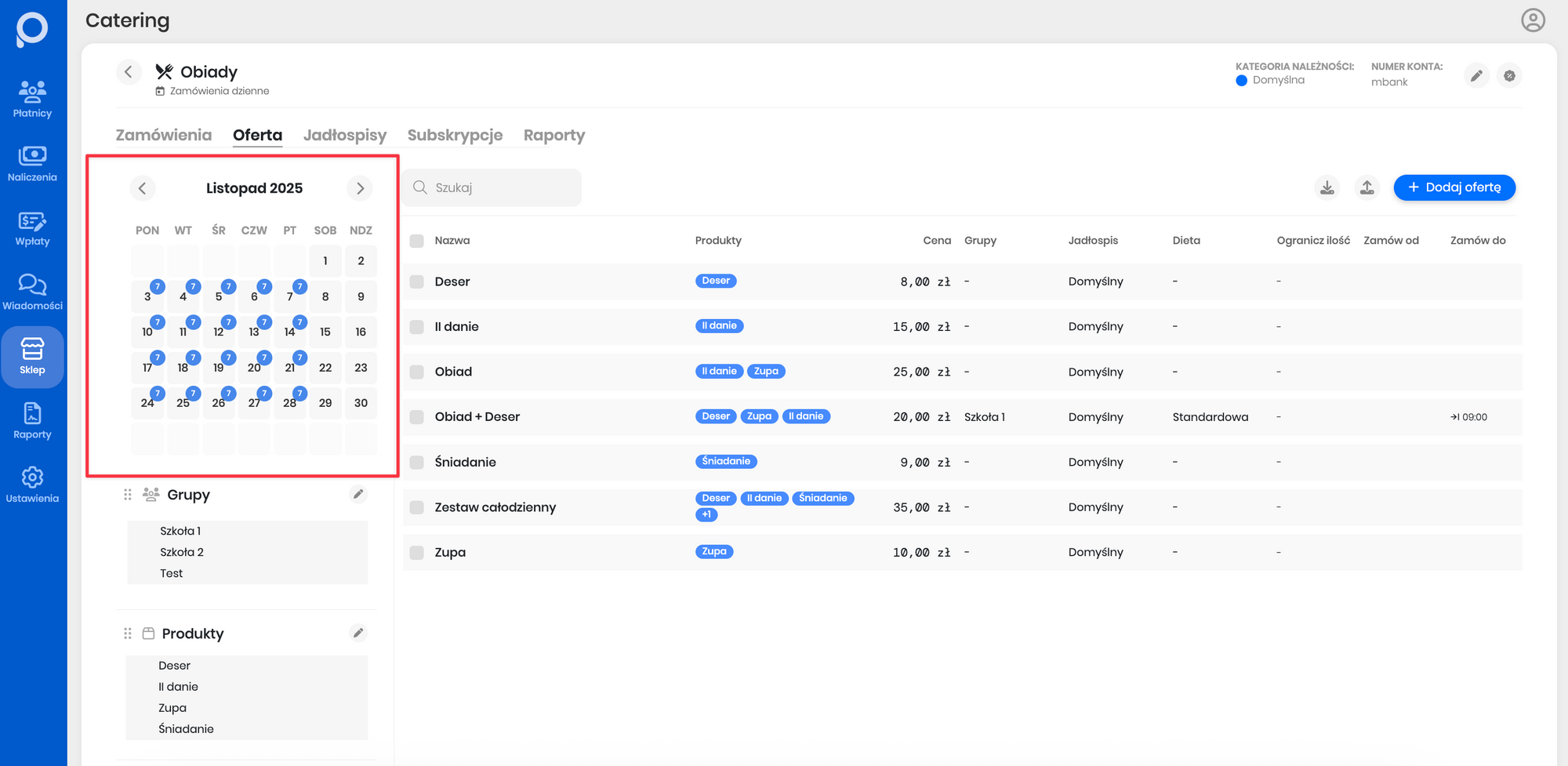 Od tego momentu oferta jest już dostępna do zamówienia przez użytkowników. W kalendarzu po lewej stronie ekranu oferty, w małych niebieskich kółeczkach, pojawi się ilość pozycji z oferty aktywnych w dany dzień.