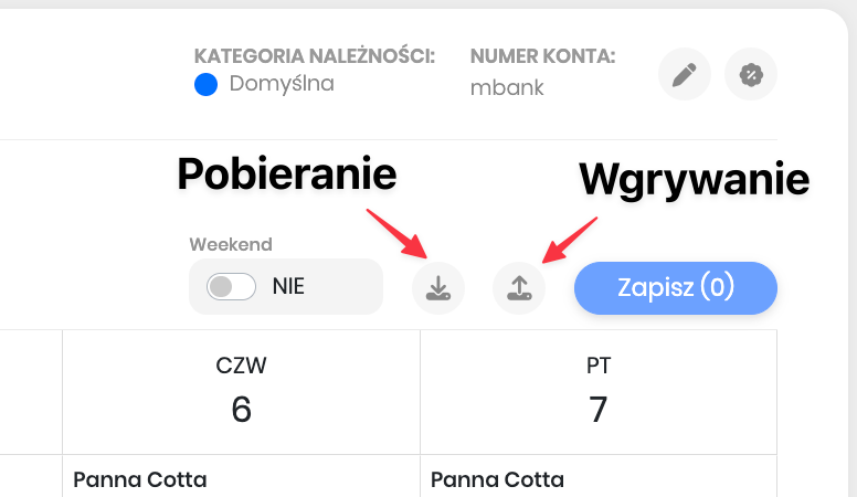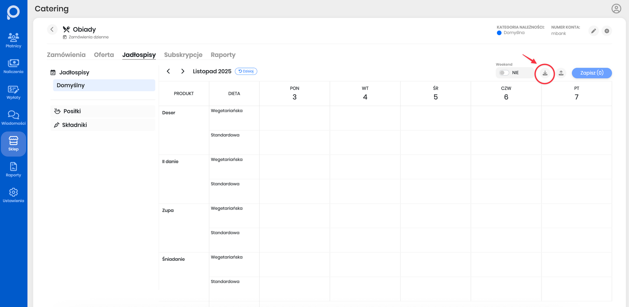 W razie potrzeby, po zapisaniu jadłospisu, możesz go ponownie eksportować korzystając z tej samej strzałki co przy pobieraniu pustego jadłospisu.