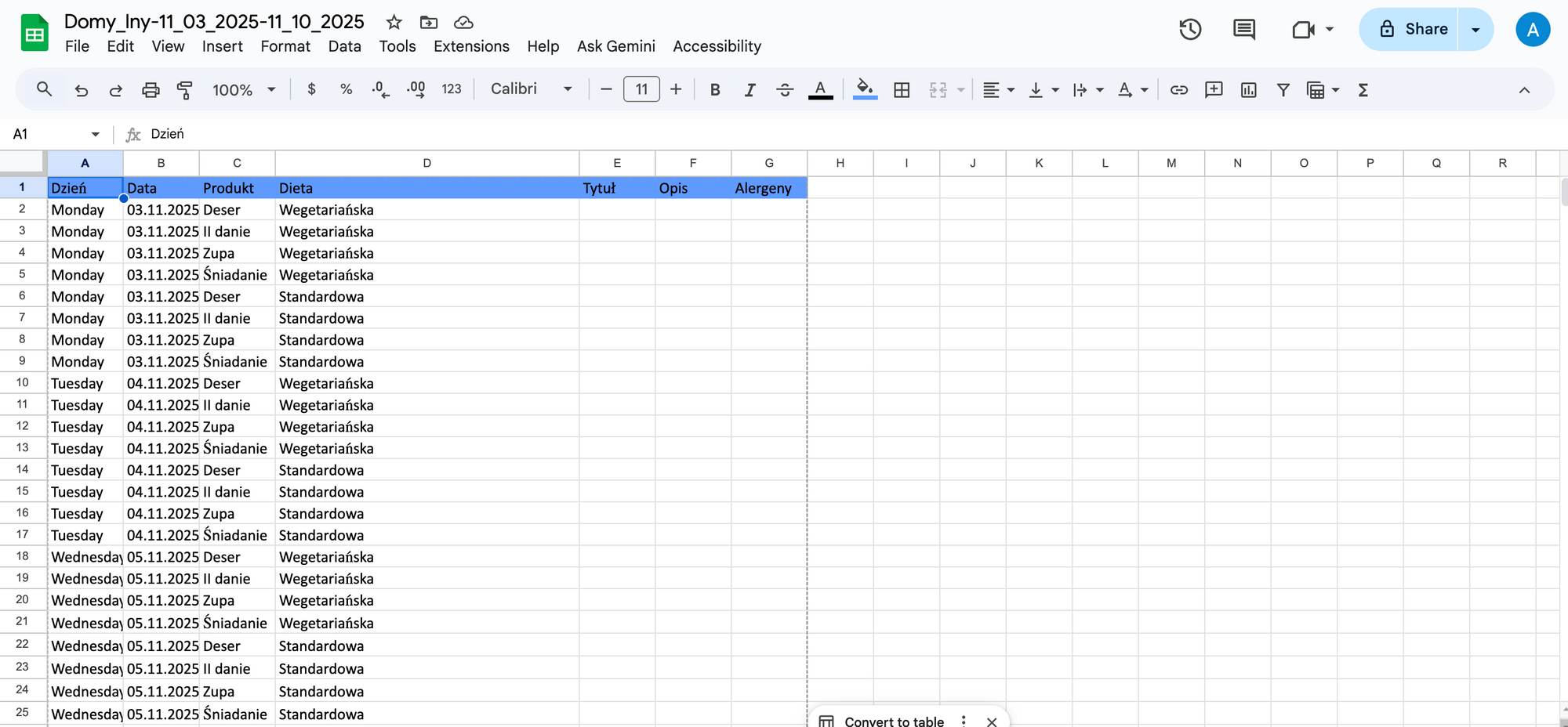 Aby poprawnie zaimportować jadłospis, w pierwszej kolejności wprowadź odpowiednie posiłki przy odpowiedniej dacie oraz produkcie. Wszystkie pozycje z jadłospisu wpisz w kolumnie "Tytuł".