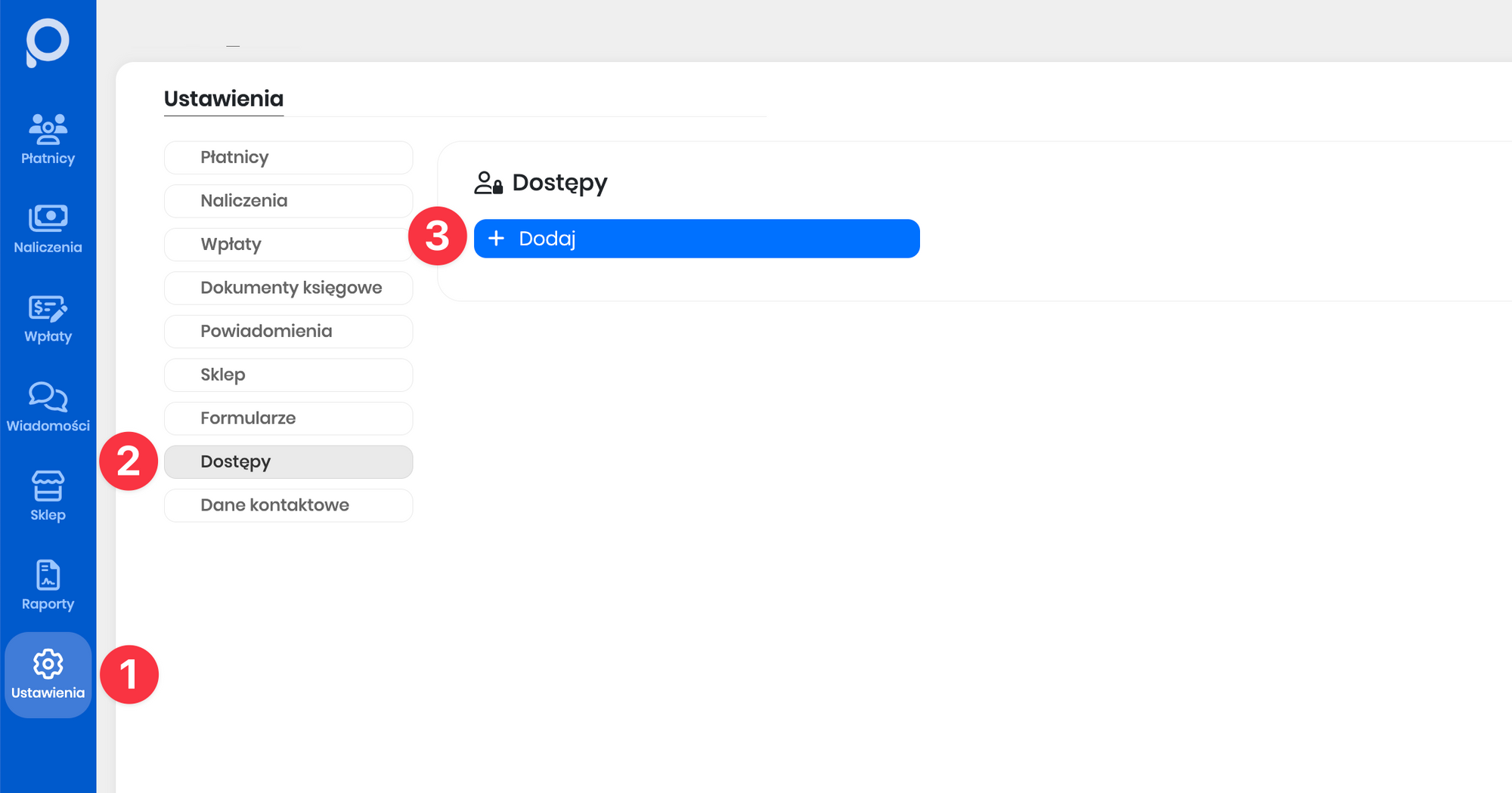 Aby nadać uprawnienia nowemu użytkownikowi wejdź na ekran Ustawienia, zakładka Dostępy.