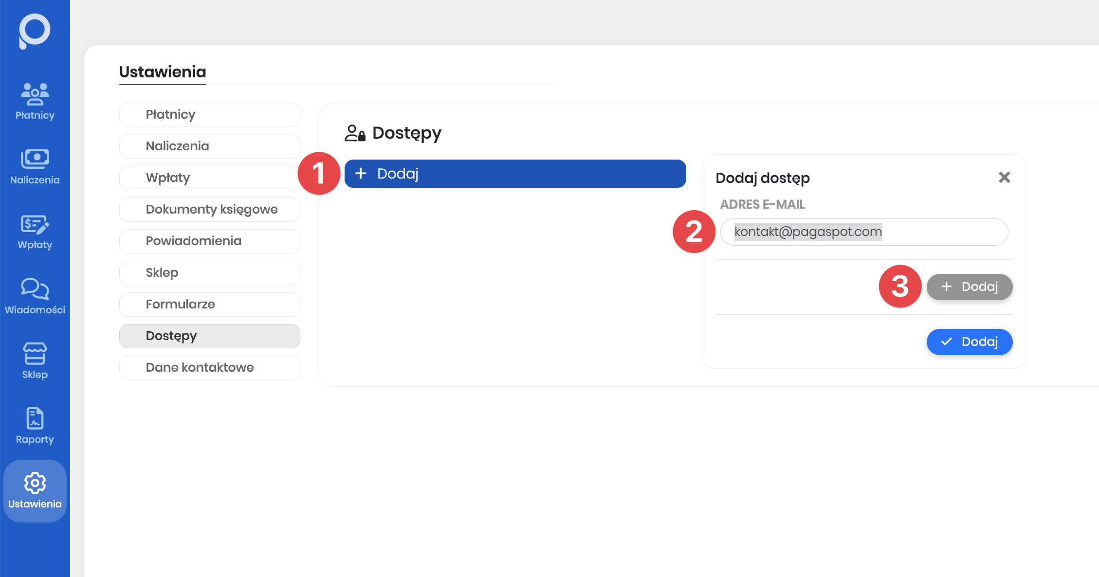 Kliknij Dodaj, wpisz adres mailowy i potwierdź klikająć szary przycisk Dodaj.