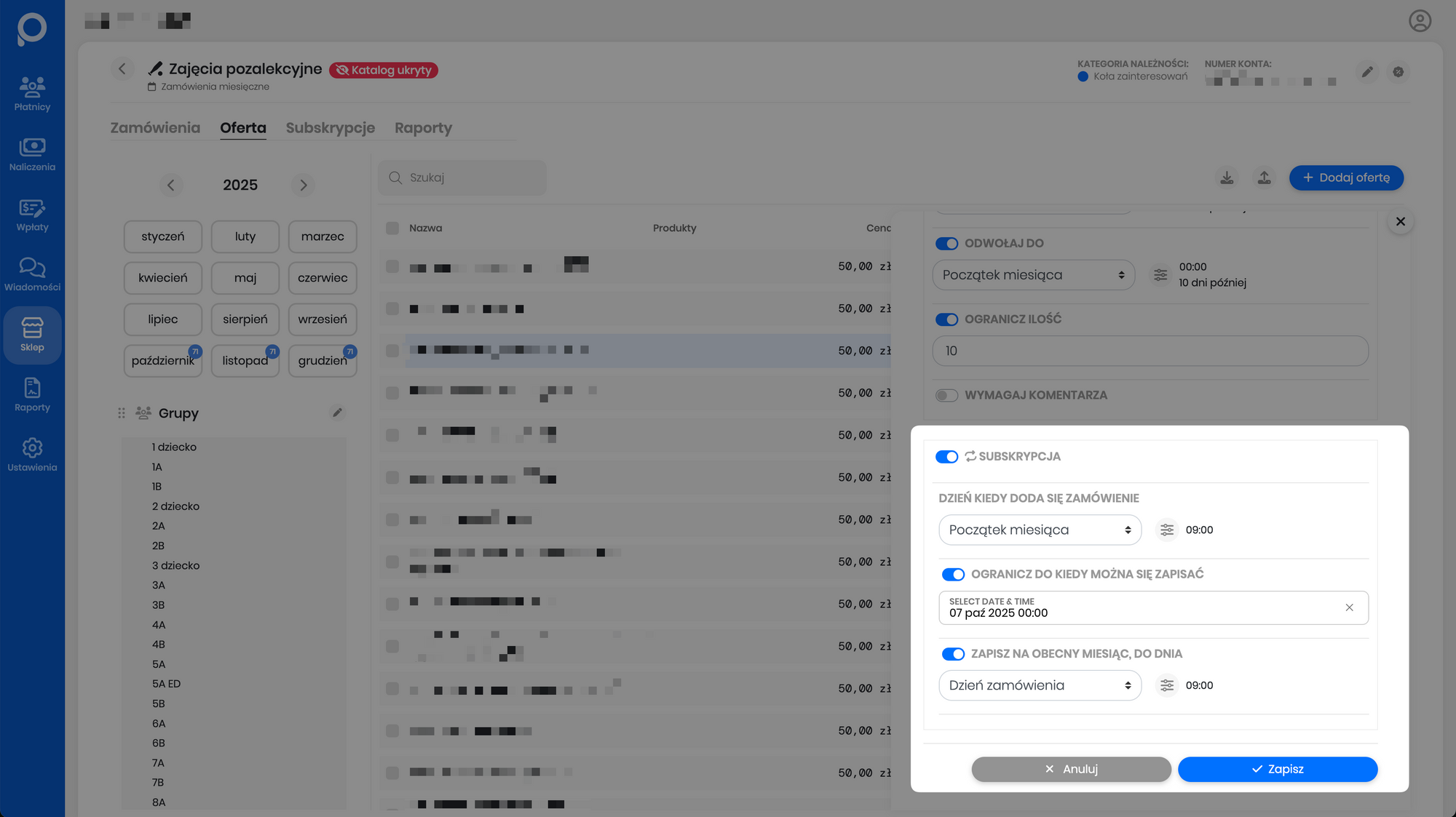 - Zapisz na obecny miesiąc do dnia - jeśli chcesz by nowe osoby mogły dopisać się do subskrypcji, ustal do kiedy jest to możliwe na aktualny miesiąc (dostępne są następujące opcje: początek miesiąca, koniec miesiąca, dzień zamówienia). W przypadku każdej z nich możesz dodatkowo ustalić godzinę i liczbę dni. Za pomocą tej funkcji możesz umożliwić rodzicowi zapisanie się np. do 7 dnia miesiąca do godziny 12:00 na zajęcia w tym miesiącu